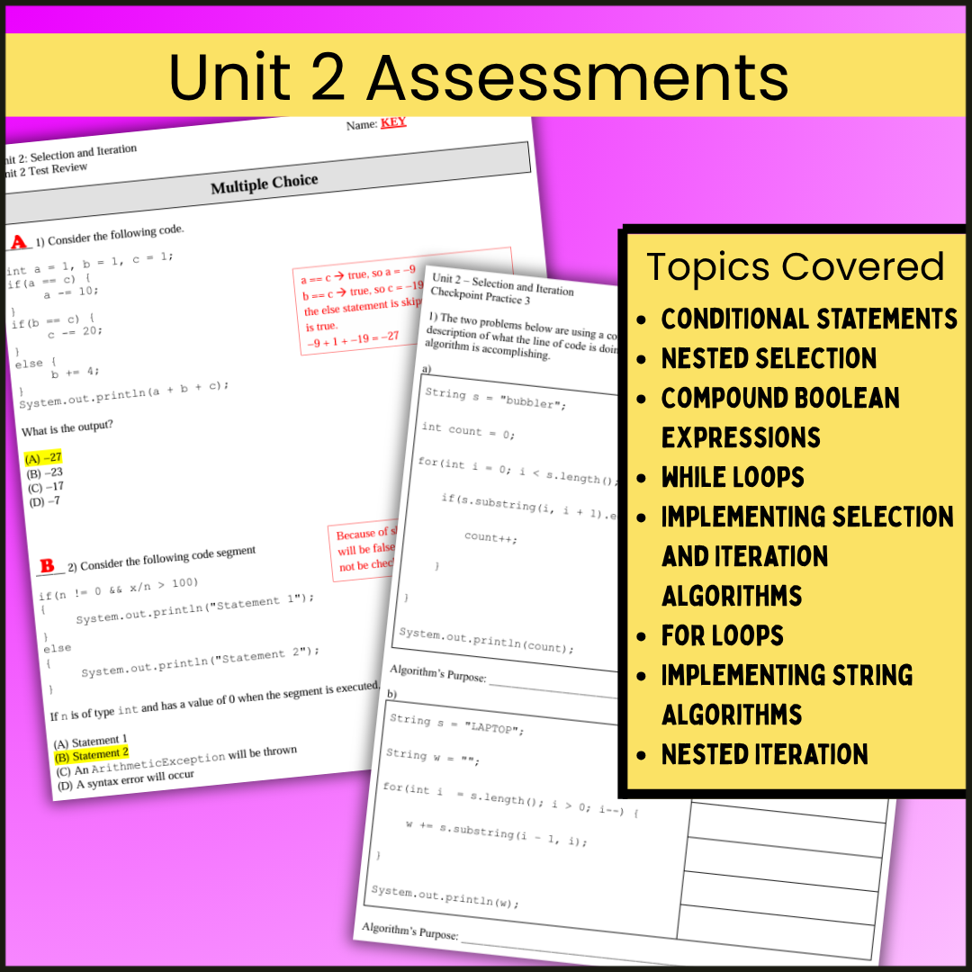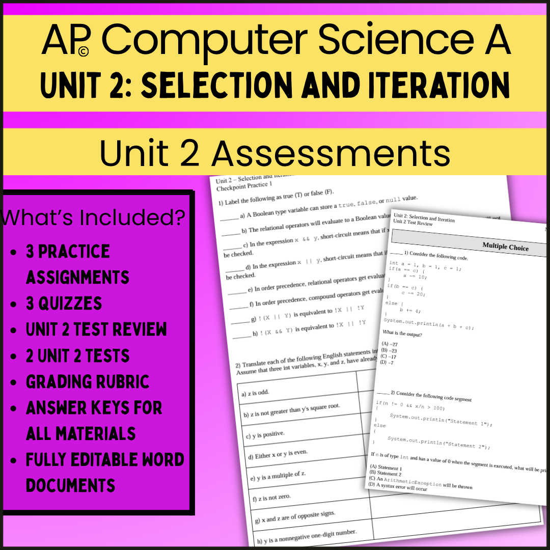 Looking for high-quality, time-saving assessments for AP Computer Science A Unit 2? This AP CSA Unit 2 Assessment Bundle includes everything you need to evaluate your students’ understanding of Java selection and iteration -- aligned to the updated 2025 College Board CED.