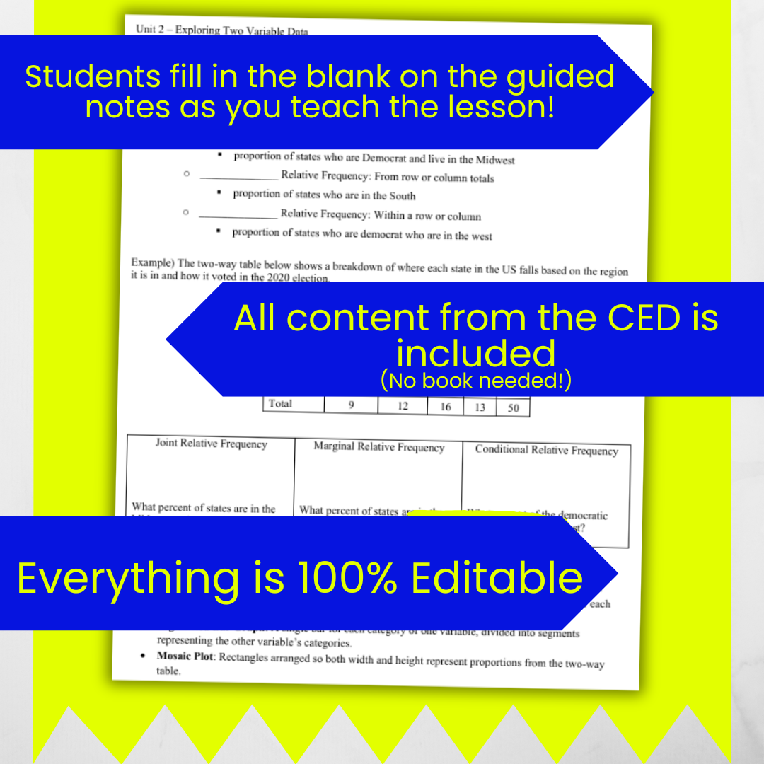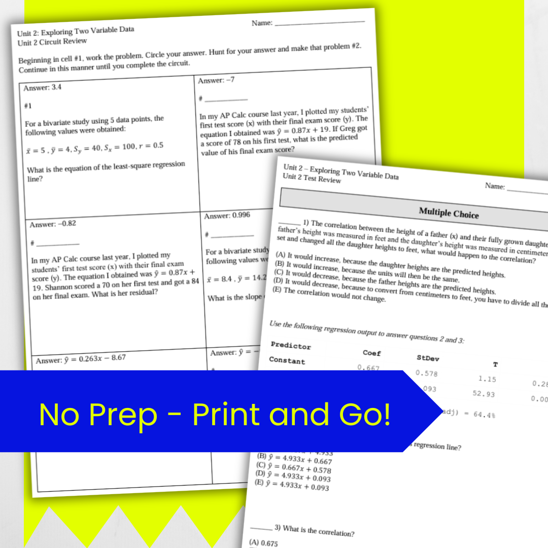 This all-in-one unit includes everything you need to teach Unit 2 of AP® Statistics: Exploring Two-Variable Data. This bundle covers methods for analyzing relationships between two variables. Students will learn how to represent data with scatterplots, two-way tables, mosaic plots, and more; describe associations using correlation and regression; and interpret residuals, transformations, and influential points to deepen their understanding of two-variable data.