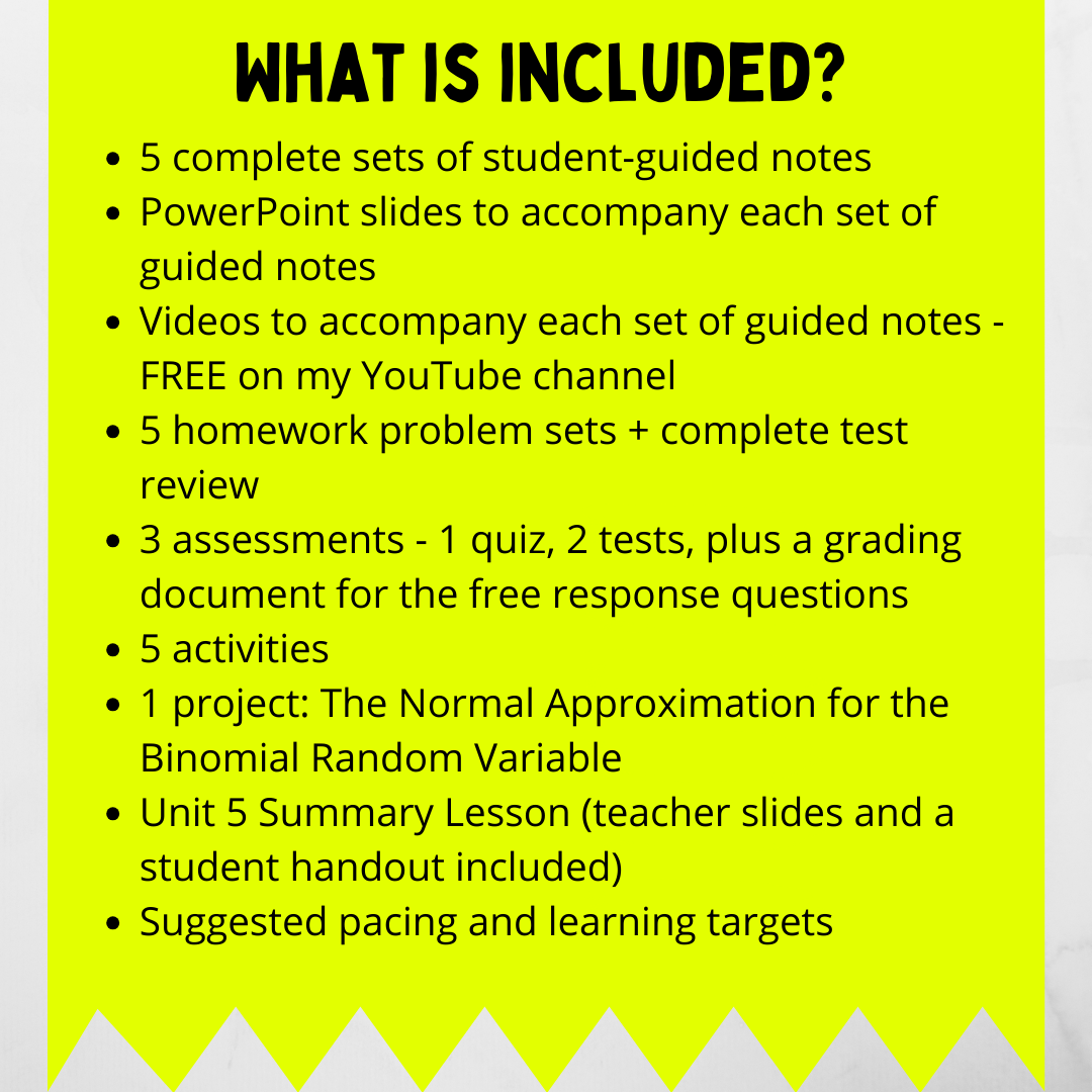 "This is a great unit with lots of content inside it! This is my first year teaching Statistics so this unit was a life saver, and I went ahead and purchased Unit 6! Thank you for a great curriculum!"