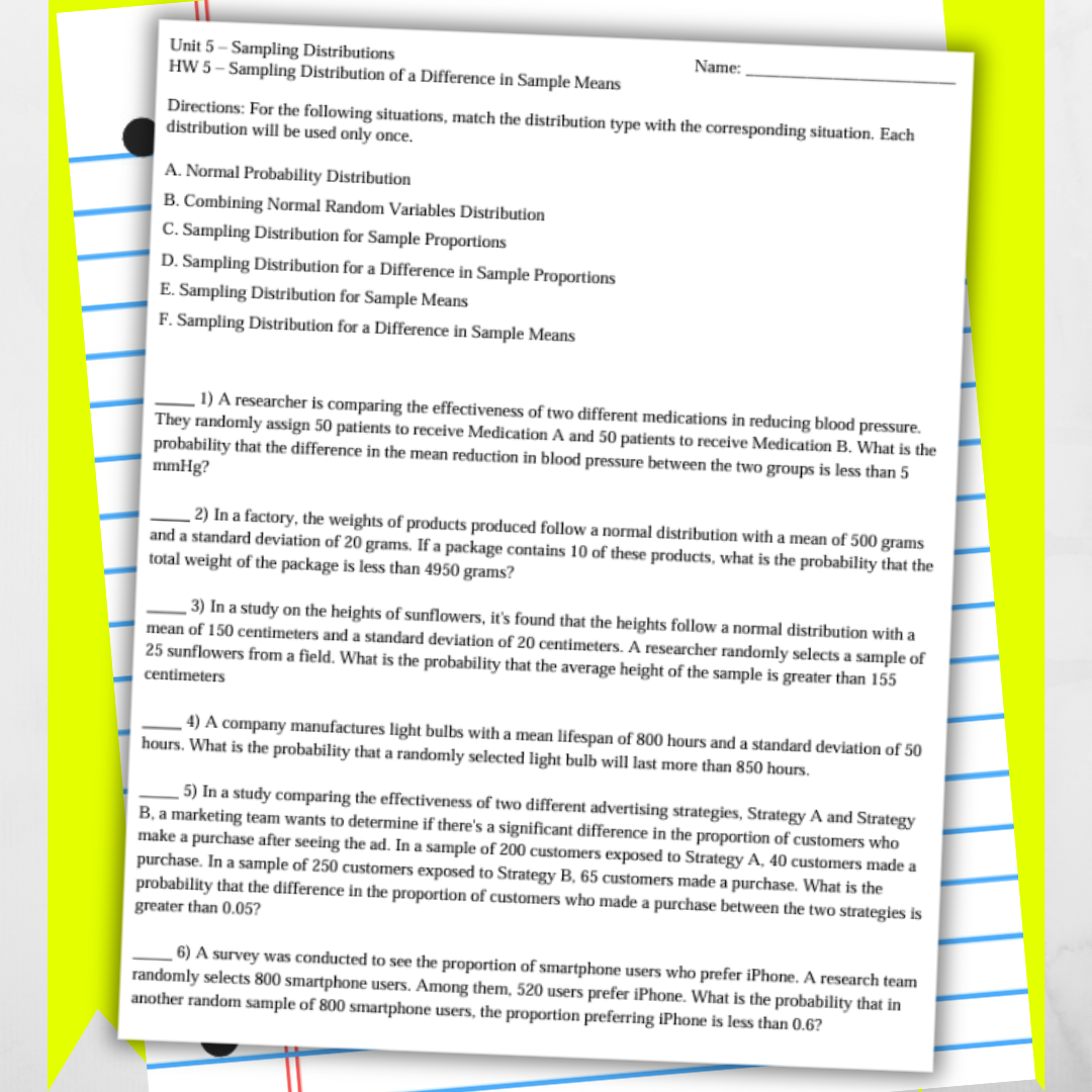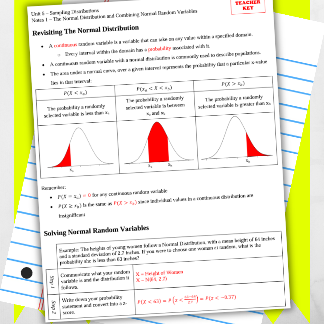 This unit contains everything you need to teach "Sampling Distributions" in AP® Statistics or regular-level Statistics. Students will go through how to calculate probabilities involving the normal probability distribution; calculate and interpret parameters, check appropriate conditions, and calculate and interpret probabilities of a sampling distribution for sample proportions (and a difference in sample proportions); and calculate and interpret parameters, check appropriate conditions, and calculate and interpret probabilities of a sampling distribution for sample means (and a difference in sample means).