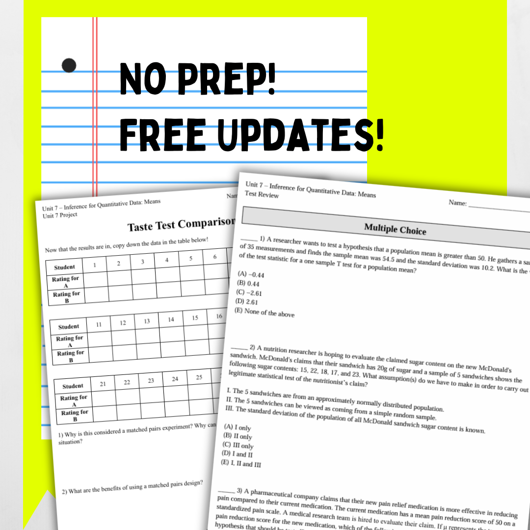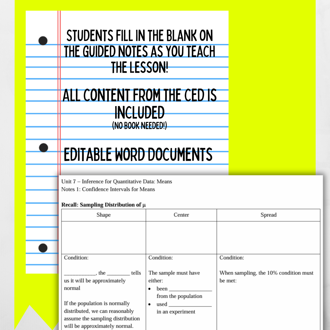 This unit contains everything you need to teach "Inference for Quantitative Data: Means" in AP® Statistics. Students will go through how to describe t-distributions and their properties; calculate, interpret, and justify a claim about a confidence interval for a population mean; identify the null and alternative hypotheses for a population mean and identify an appropriate testing method for a population mean while verifying the conditions for making statistical inferences; and · calculate the test statistic and p-value, interpret the p-value, and justify a claim about the population based on the results of a significance test for a population mean.