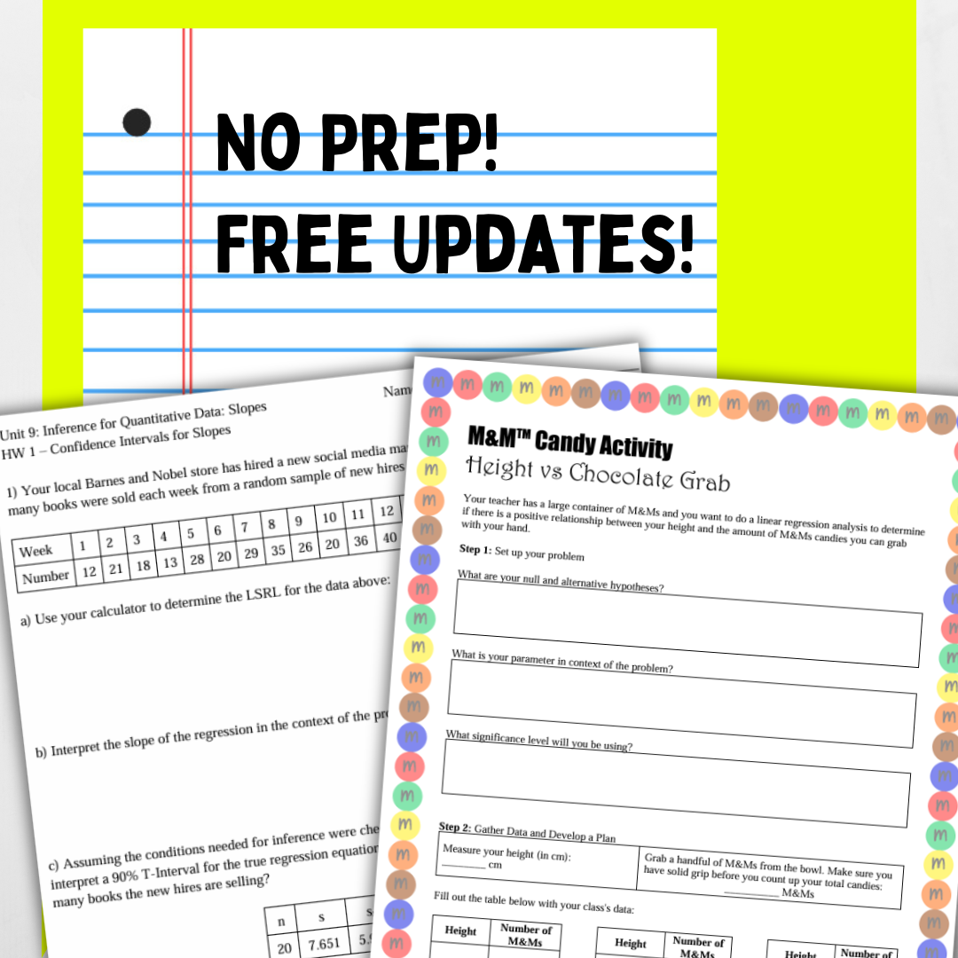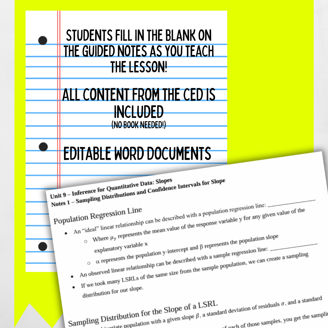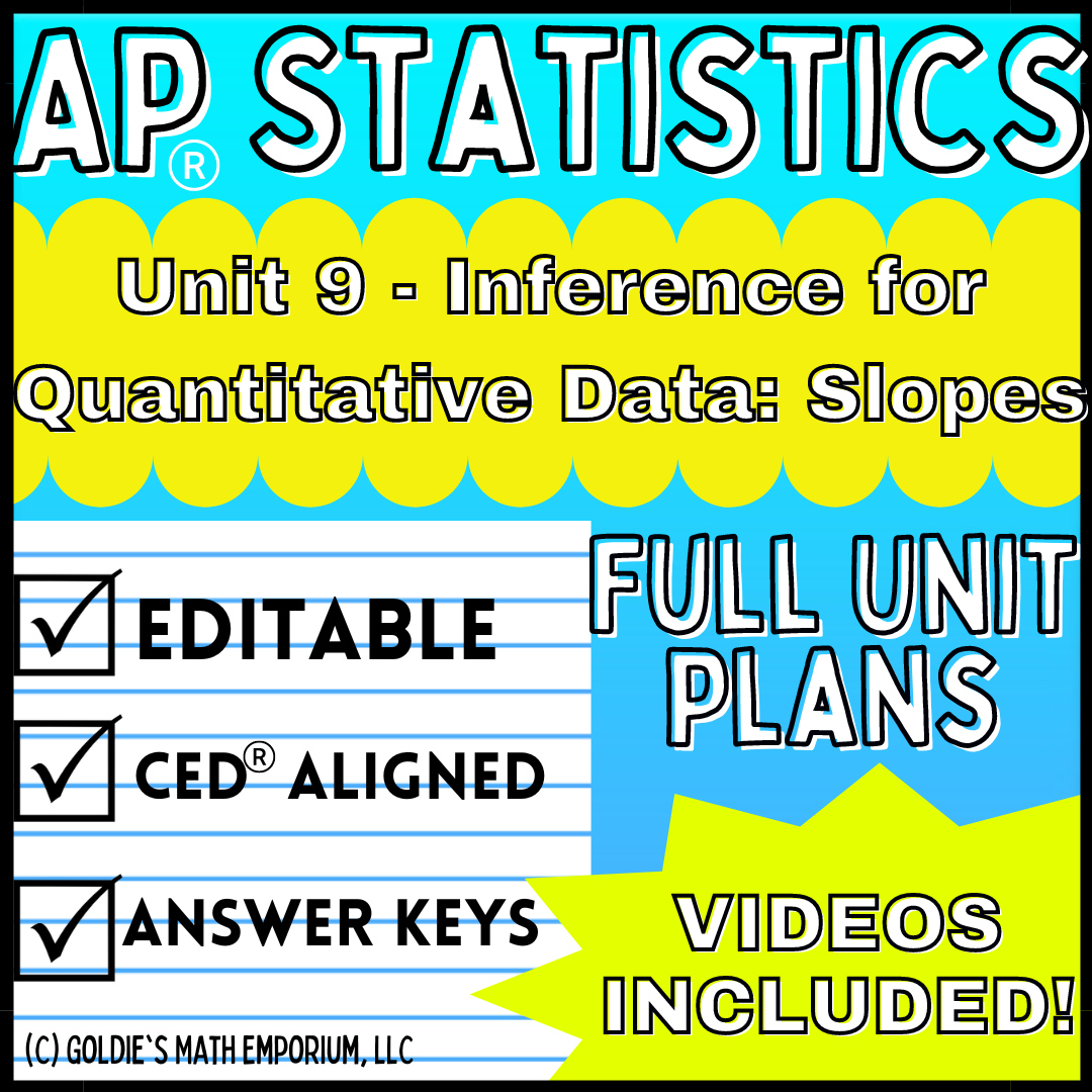 This unit contains everything you need to teach "Inference for Quantitative Data: Slopes" in AP® Statistics or regular-level Statistics. Students will go through how to identify an appropriate confidence interval procedure, verify the conditions, calculate and interpret the interval for a slope of a regression model; and identify the null and alternative hypotheses, verify the conditions for making statistical inferences, calculate the test statistic and p-value, interpret the p-value, and justify a claim about the population based on the results of a significance test for a slope of a regression model.