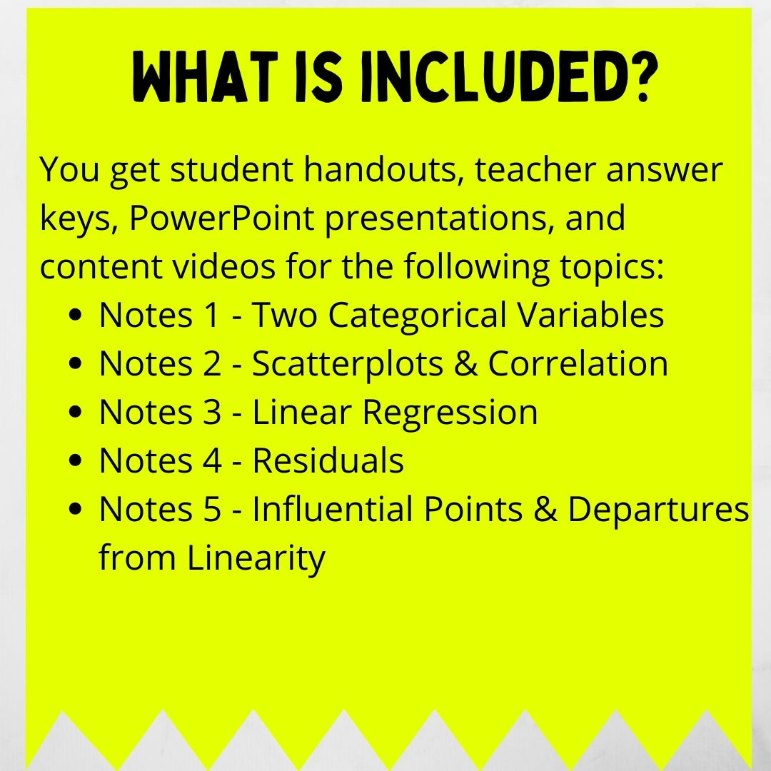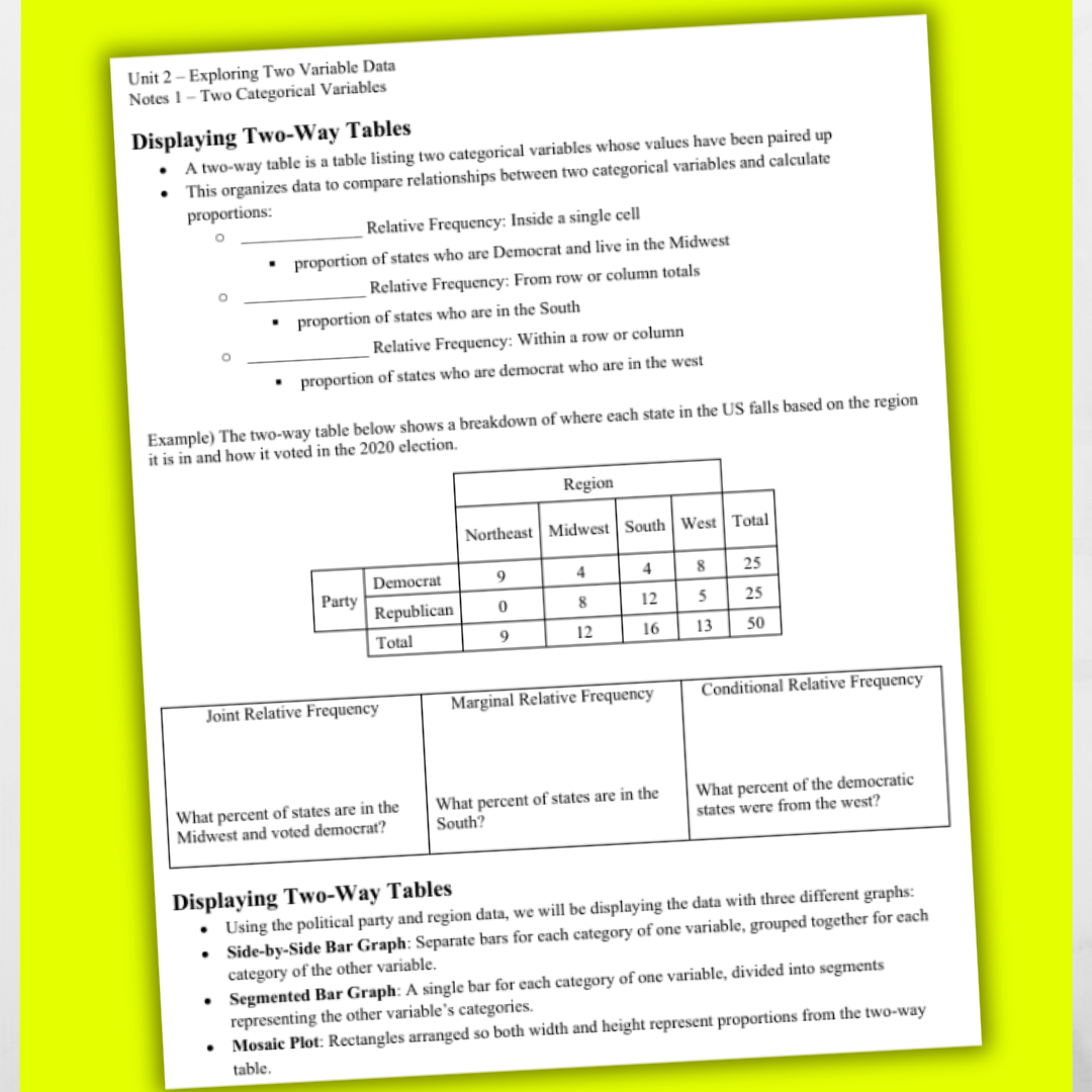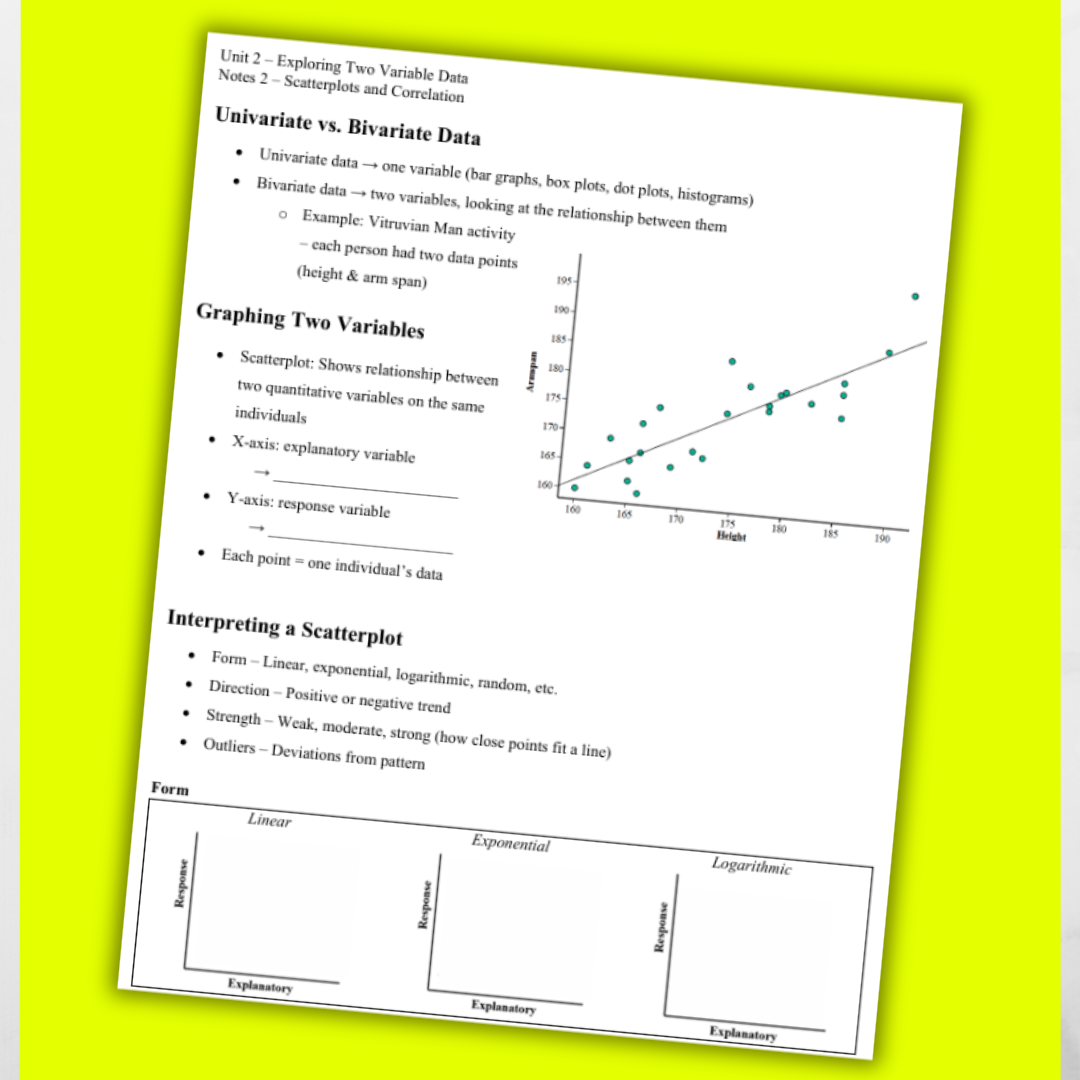 Looking for clear, organized, and editable guided notes to teach the second unit of AP® Statistics? This resource includes everything you need to help your students master Exploring Two-Variable Data, from mosaic plots to the least-squares regression line. Designed for your AP® Statistics course, these notes are perfect for direct instruction, interactive notebooks, or a flipped classroom model.