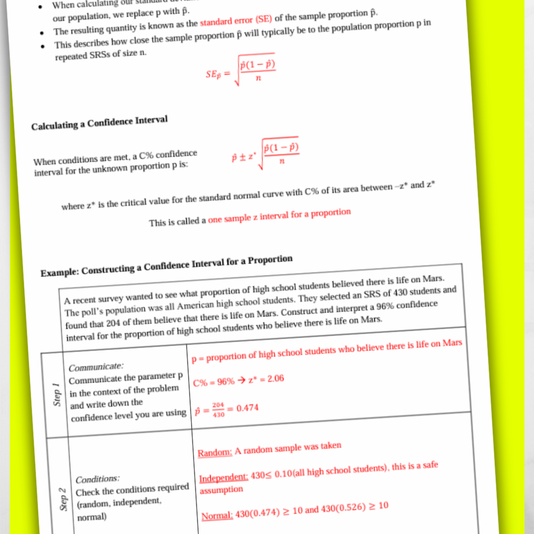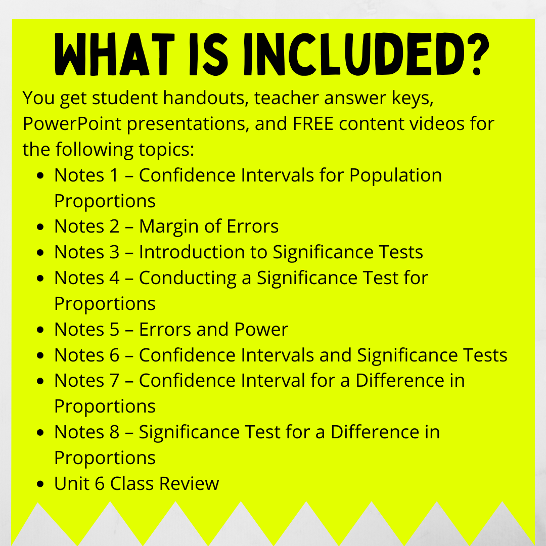 This resource is designed to save you YOUR TIME! This has everything you need to confidently teach Inference for Proportions to your students, including guided notes, slides, videos, and complete answer keys. All the content from the AP Stat CED is included!