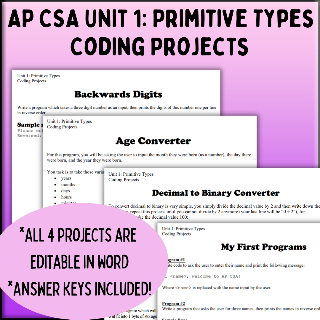 The material covered in these projects aligns with Unit 1 of the AP® CSA CED. These projects ask students to code in the Java programming language.