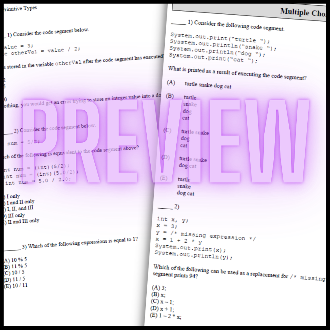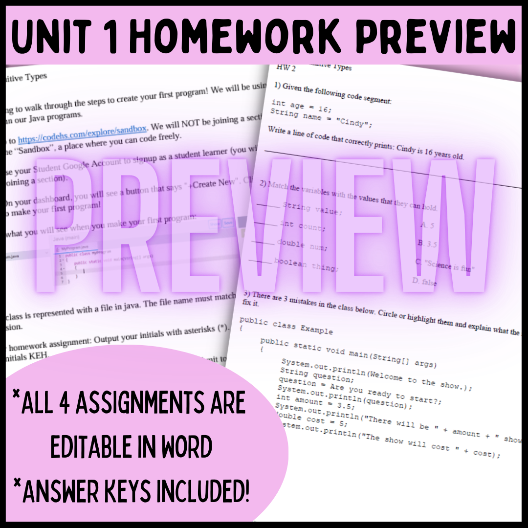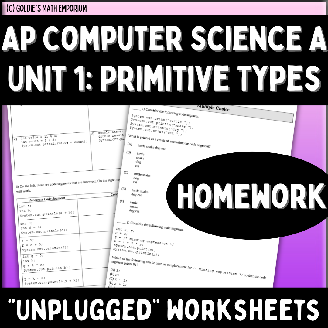 Goldie's AP® Computer Science A Unit 1: Primitive Types HOMEWORK