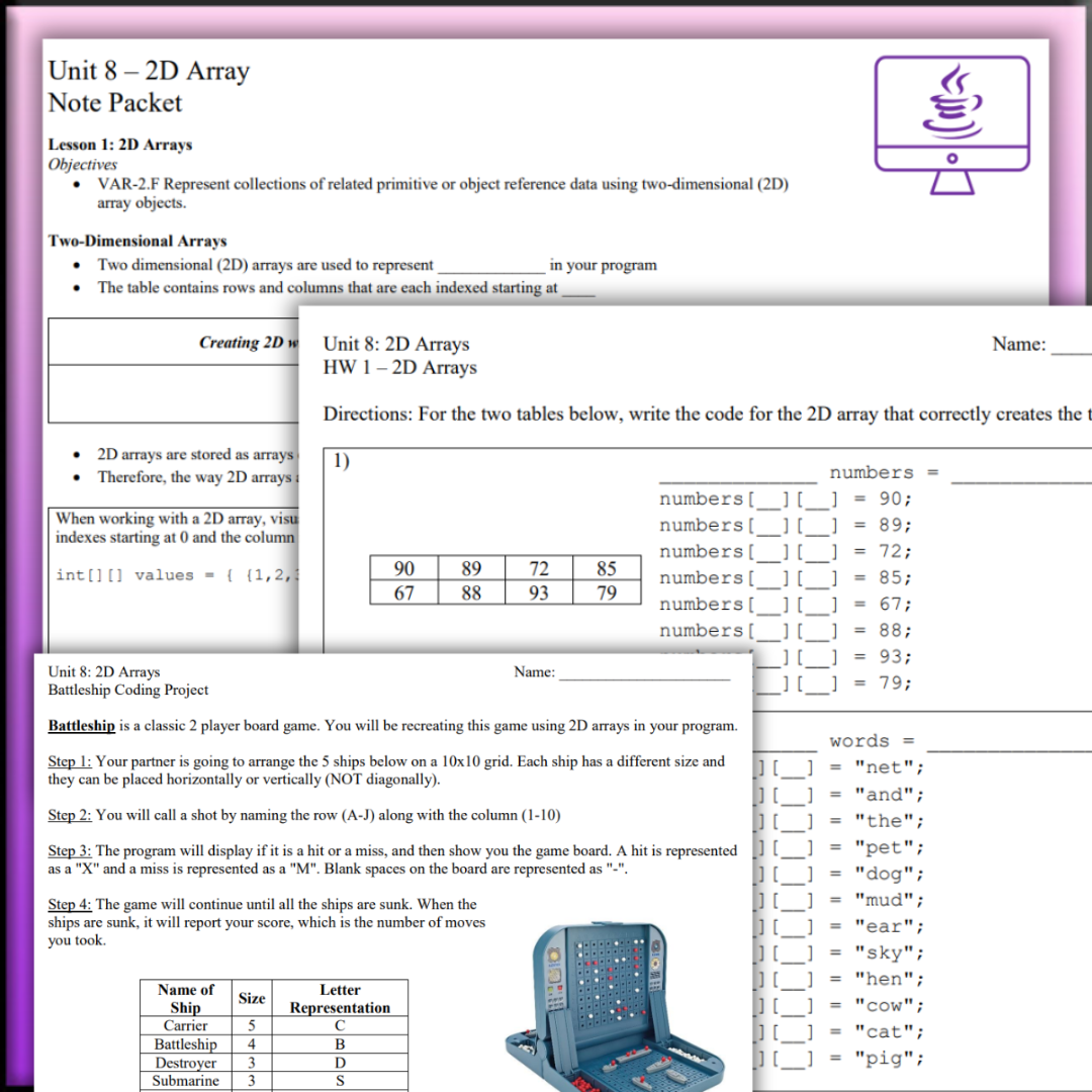 Welcome! If you are reading this, you are interested in getting some AMAZING resources for your AP® Computer Science A classroom. This class is an introductory course in the Java programming language. In this unit, students learn about two-dimensional (2D) arrays and their algorithms.