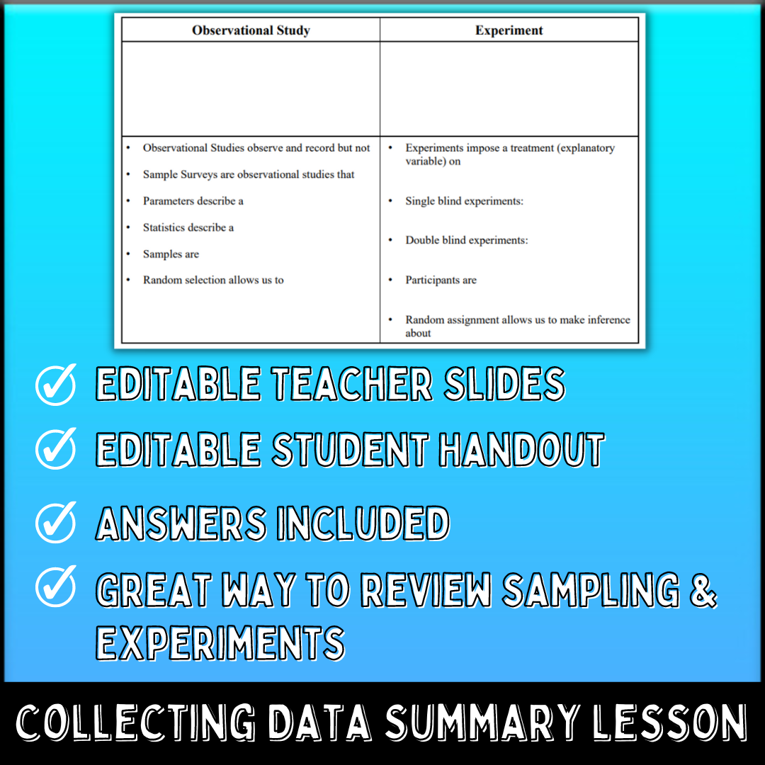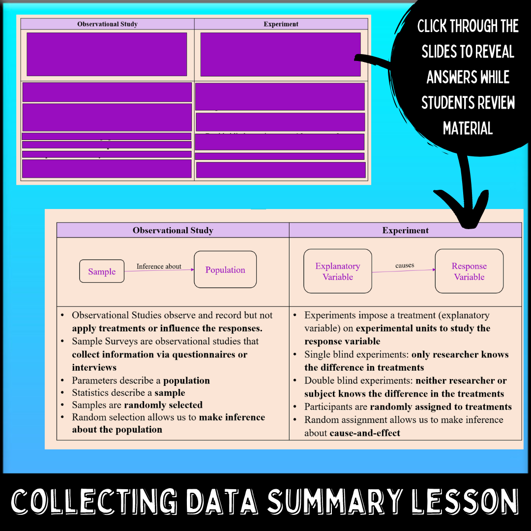 I use this in my AP Statistics class (and a modified version in my regular-level statistics class) to review the concepts in our "Collecting Data" unit.