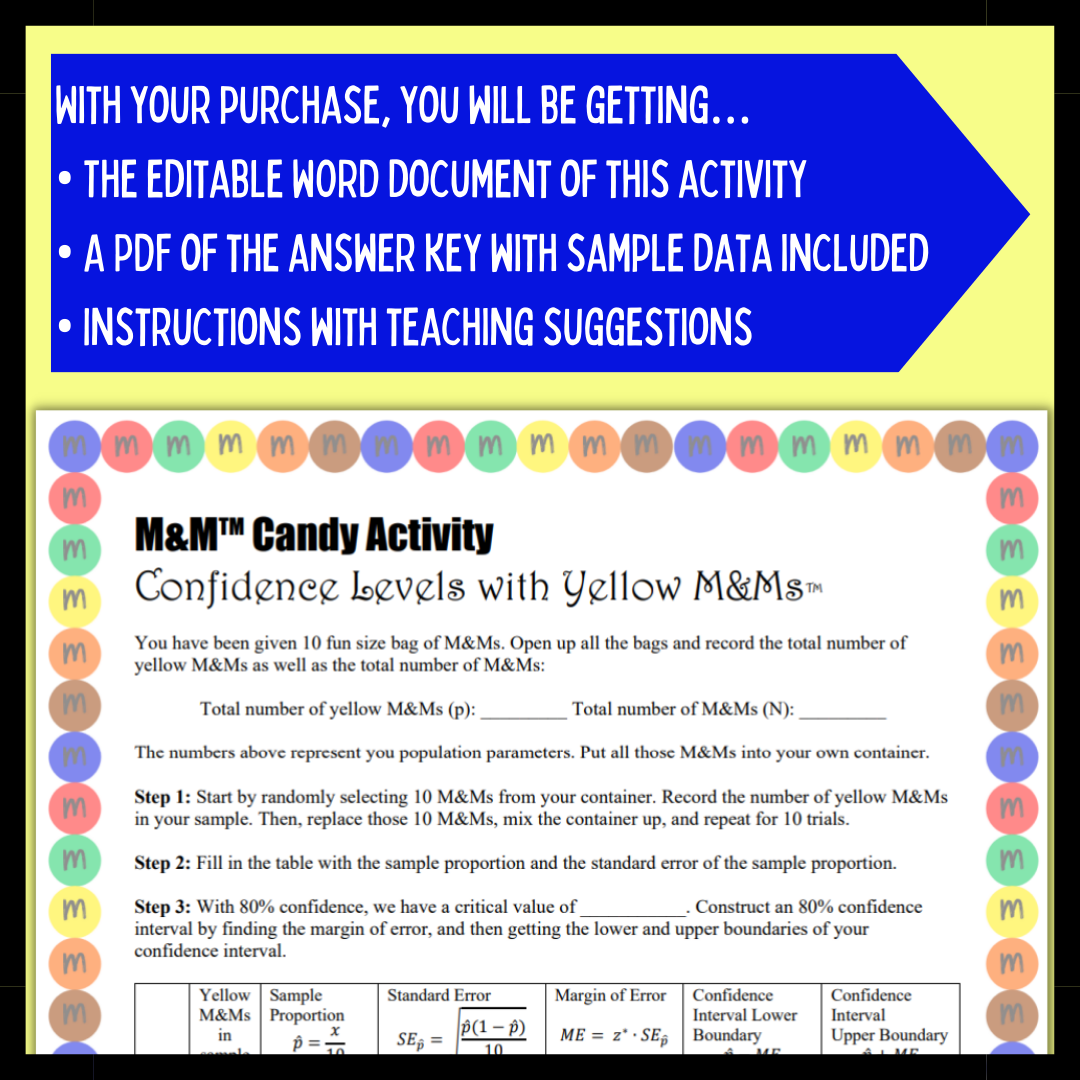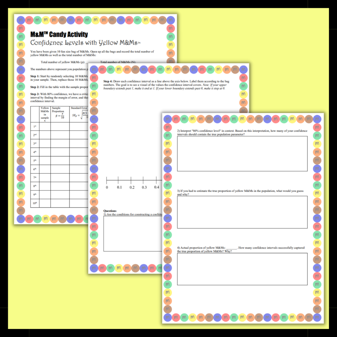 In this activity, students will create 10 confidence intervals to try and capture the known about of yellow M&Ms in their population. They will understand the difference between a confidence interval and a confidence level.
