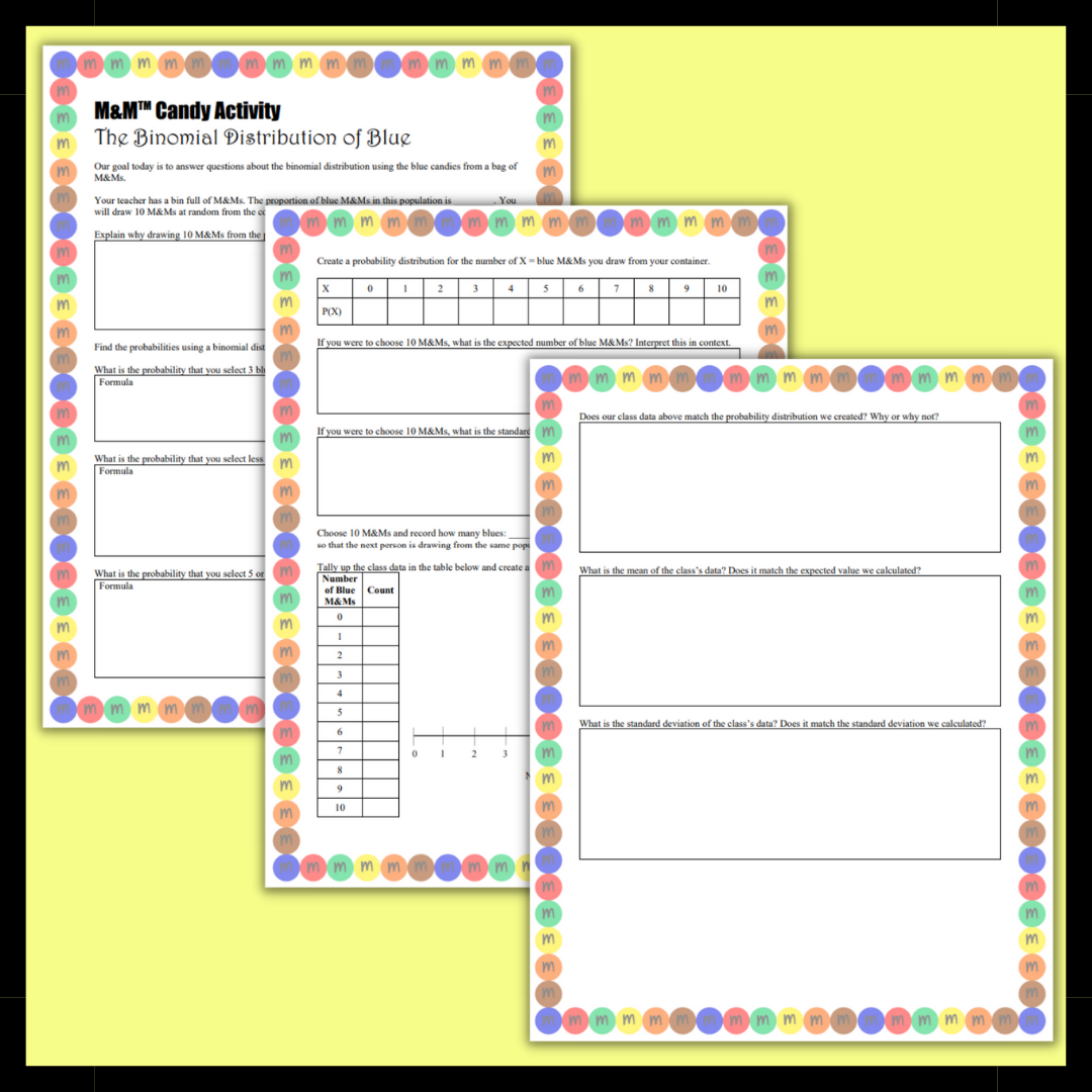 In this activity, students will practice setting up a binomial distribution and finding their probabilities. They will compare theoretical and empirical probabilities by sampling blue M&M candies from a population.