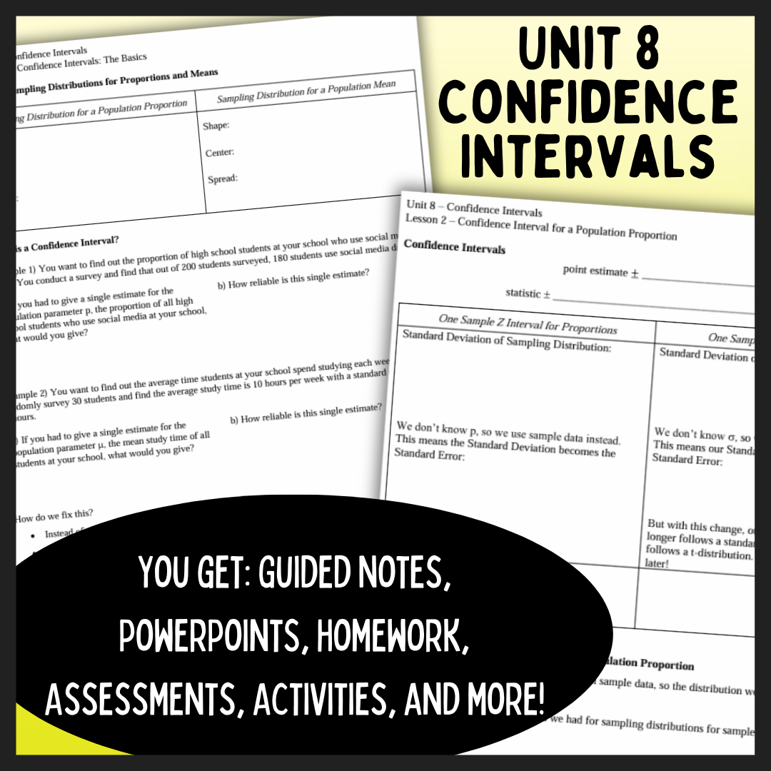 Explore comprehensive resources designed to teach students everything they need to know about confidence intervals for proportions and means. This unit bundle includes editable guided notes, homework sets, assessments, and engaging activities to support thorough understanding.
