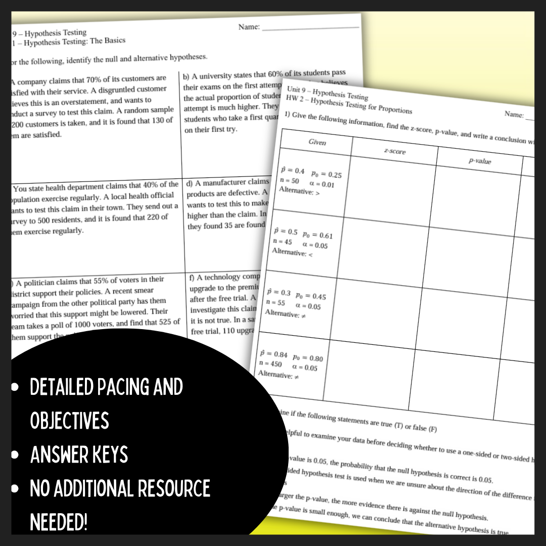 Master hypothesis testing for means and proportions with this all-inclusive unit bundle, featuring editable guided notes, homework sets, assessments, and engaging classroom activities. Perfect for comprehensive learning, this resource covers everything from null and alternative hypotheses to Type I and Type II errors, ensuring student success.