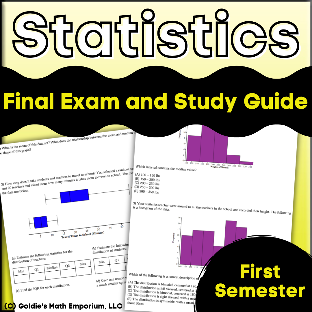 Ace your end-of-semester assessments with this comprehensive Semester 1 Final Exam and Study Guide for On-Level Statistics! This resource includes a 50-question multiple-choice final exam and a 15-page study guide filled with open-ended questions to reinforce key concepts. Whether you're a first-year teacher looking for a complete, ready-to-use resource or a veteran educator seeking to save time, this product has everything you need to confidently assess and prepare your students.