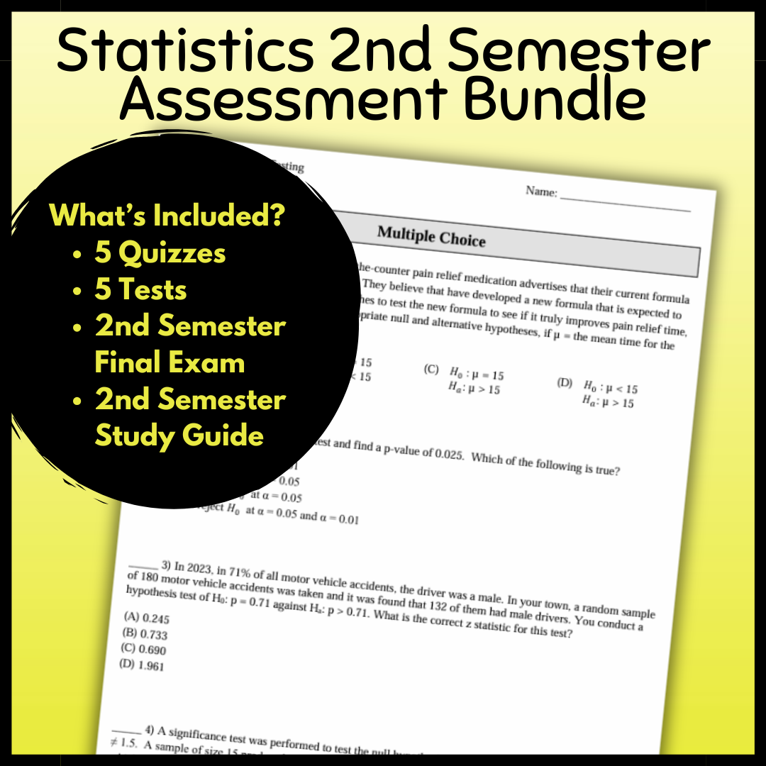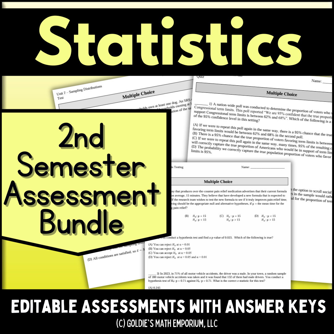 In this resource, you will find all my assessments in my on-level statistics course. These assessments cover everything from sampling distributions to the chi-square distribution. Each assessment is a mixture of multiple-choice questions (with 4 answer choices) and free-response questions. All files are editable in Word and each document also comes with a detailed answer key for each problem.